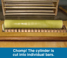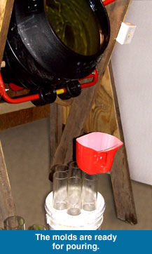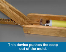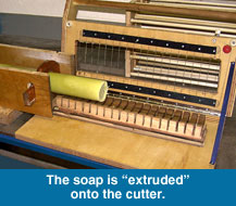 I first started making soap as a hobby, something to try my hand at. I subscribed to several soap making mailing lists and discovered that everyone seemed to be making soap one bar at a time in small batches. It was a very cottage industry. Having worked in systems and manufacturing for years, I began to see ways of streamlining the han made soap process. My goal was to produce 200 bars a day in four hours or less. After four years of development, I've succeeded in my goal. My facility in Mountain Ranch is designed so that one person can, with a minimum of wasted effort, produce 200-300 bars in fewer than four hours. Where the common practice is to freeze the mold in order to remove the soap, I use a drill driven screw to push the soap out of the molds. I can unmold, slice and put onto curing racks, six molds in fifteen minutes. My slicer slices one soap log into 18-20 bars at a time. I designed a curing rack that speeds curing by allowing air to freely circulate around the soap, and also allows a very high storage density (important when you have over 4000 bars curing at a time).
