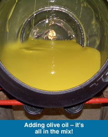 Mountain Ranch Soap is about as natural as you can get. We start with Calaveras Olive Oil which is pressed locally, in Copperopolis, California. The oil is first pressed as virgin oil, also known as lampate, which means lamp oil. Lampate is too strong for human consumption -- it is dark green and has a strong olive aroma -- but it makes good soap. The soap comes out green but fades when exposed to light, as in your shower. The other main oil we use is coconut oil. Our coconut oil comes from Spectrum Naturals, a natural products manufacturer located in Petaluma, California. The oil is expeller extracted, a process that involves no heat and no solvents. This oil costs about $4 a pint in the health food stores.